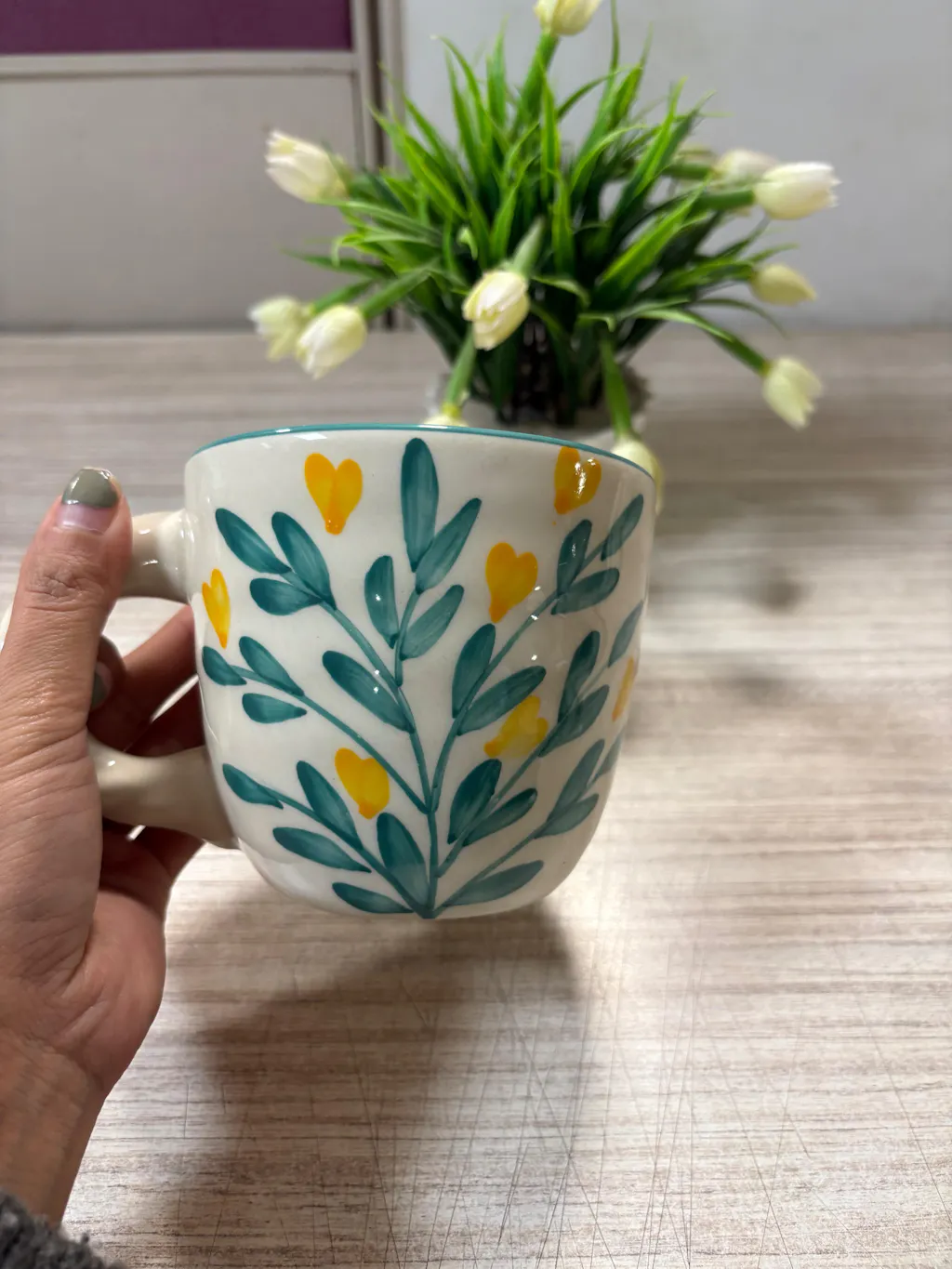 Bring home a splash of sunshine with the Gulmohar Grove Hand-Painted Ceramic Mug. Inspired by blooming garden trails, this mug features delicate yellow buds and leafy greens hand-painted on a soft ivory base — a fresh and uplifting design for your tea or coffee ritual.