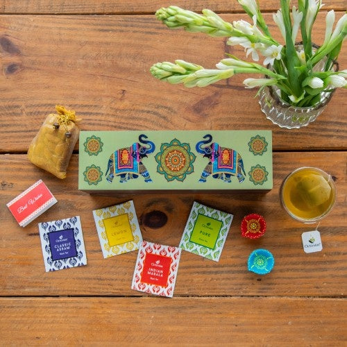Celebrate Diwali with the Festive Teabag Hamper, a luxurious handcrafted wooden gift box that combines tradition, flavor, and warmth. Featuring an assortment of Classic Assam Black Tea, Indian Masala Black Tea, Pure Green Tea, and Lemon Green Tea along with a healthy combo of Almond and Mishri and two elegant hand-painted Diyas.