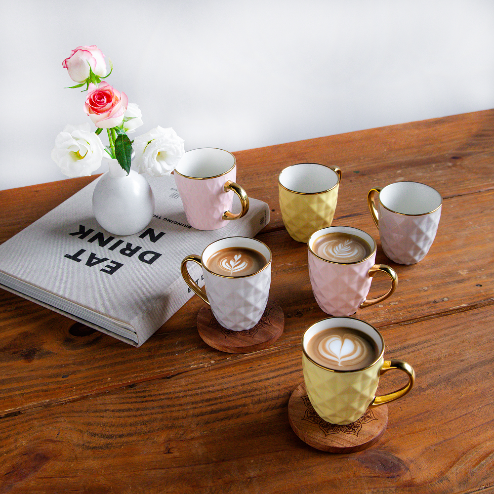Set of 6 pastel-hued ceramic teacups with diamond-textured faceted design and golden accents.