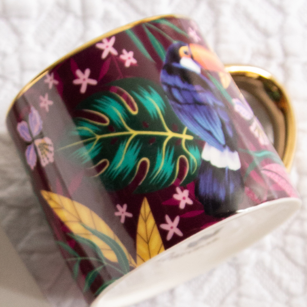 Bring tropical elegance to your tea rituals with the Golden Rainforest Tea Set. This exquisite 12-piece set includes 6 cups with matching saucers, featuring rainforest-inspired motifs of toucans, butterflies, and lush foliage. Gleaming golden rims and handles add opulence, making each piece a statement of artistry and sophistication. Crafted for tea lovers who cherish unique designs, this set is perfect for both intimate teatime moments and hosting gatherings. It also makes for an extraordinary gift, ideal for weddings, anniversaries, or festive occasions.