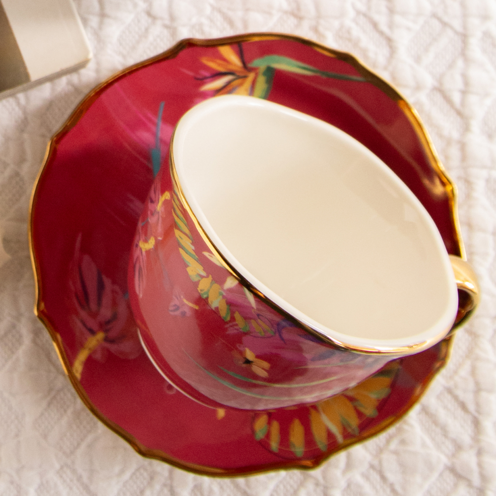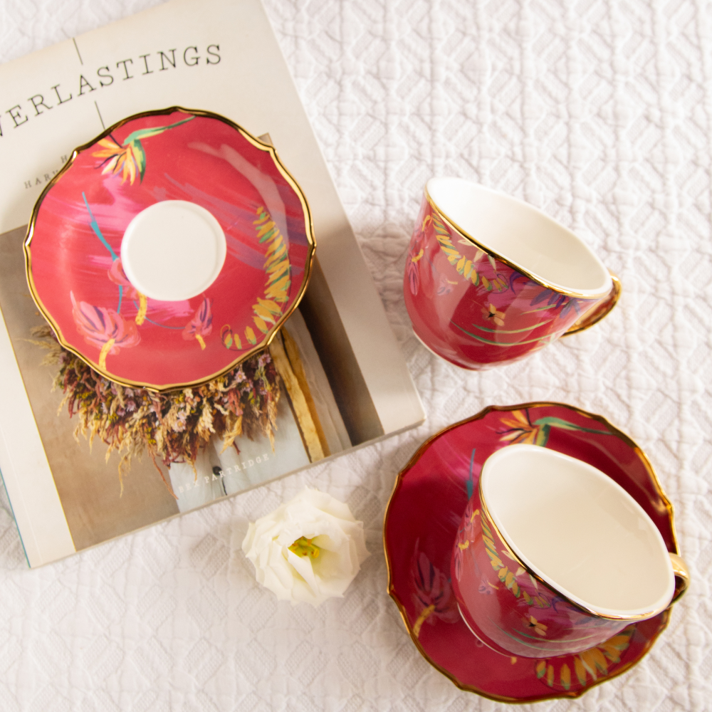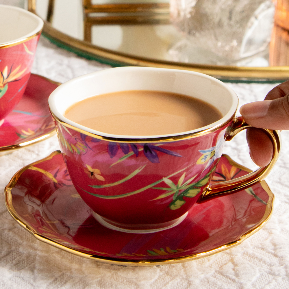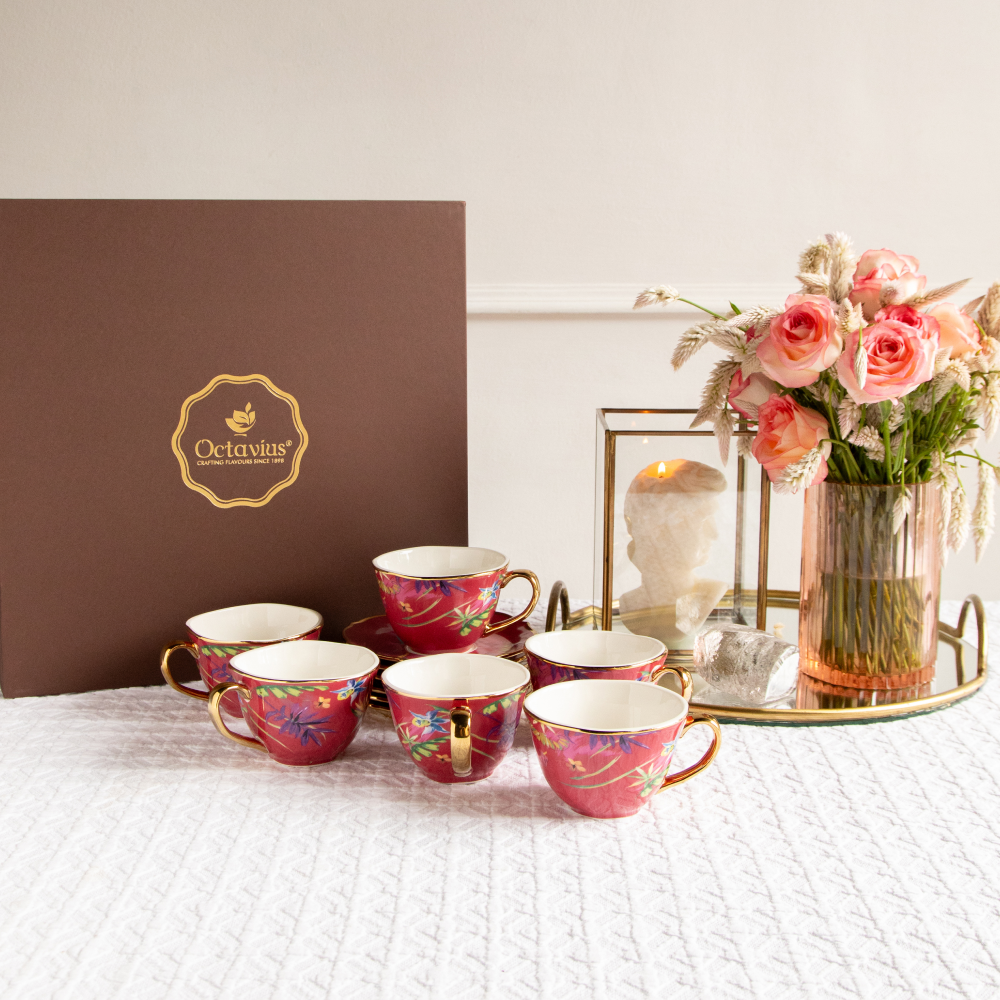 Imperial Crimson Bloom Tea Set (6 Cups & Saucers) – 200 ml