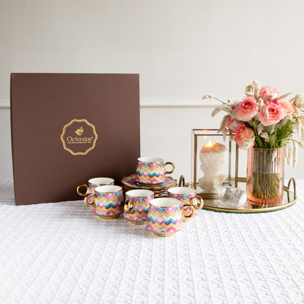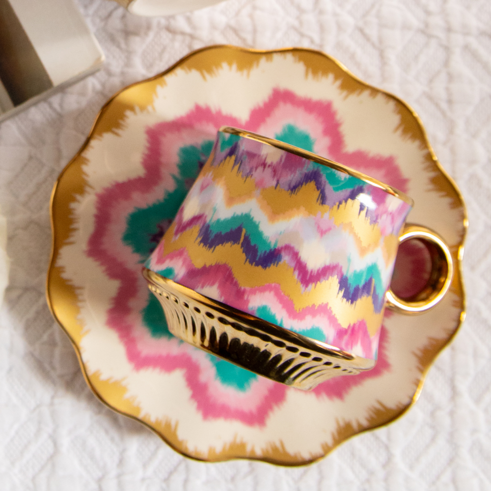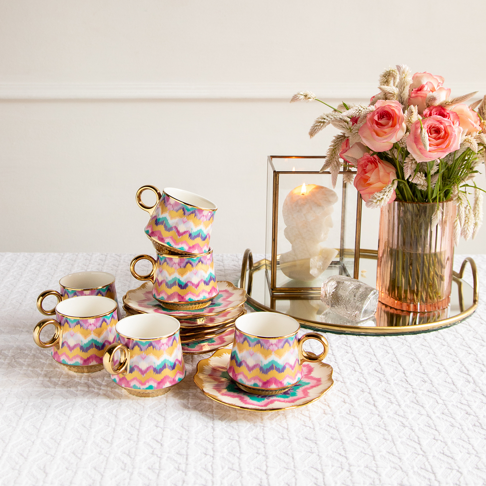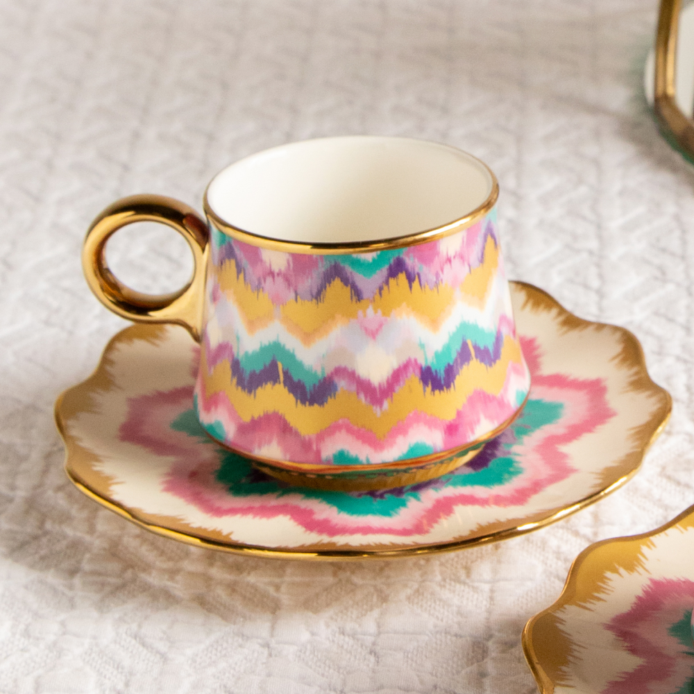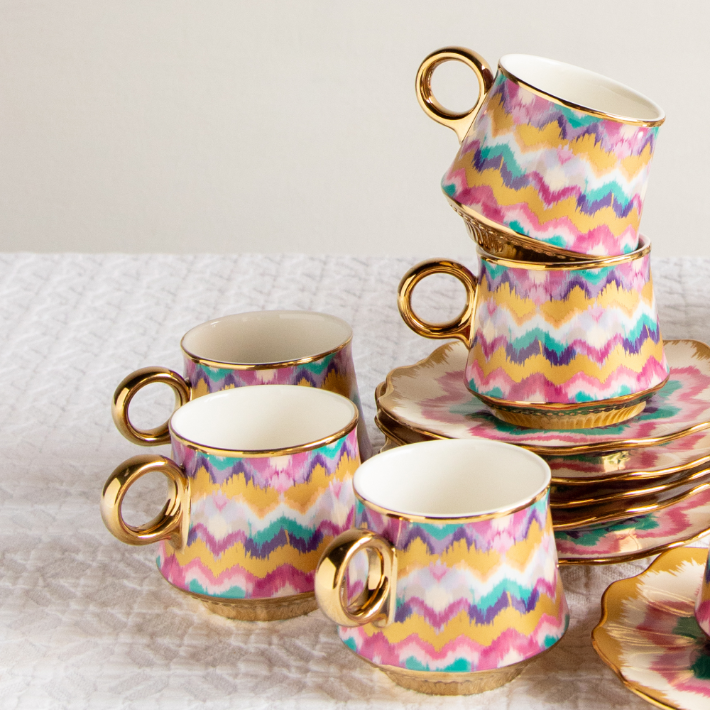 Set of 6 cups with matching saucers in vibrant ikat wave design, highlighted with golden rims and detailing.