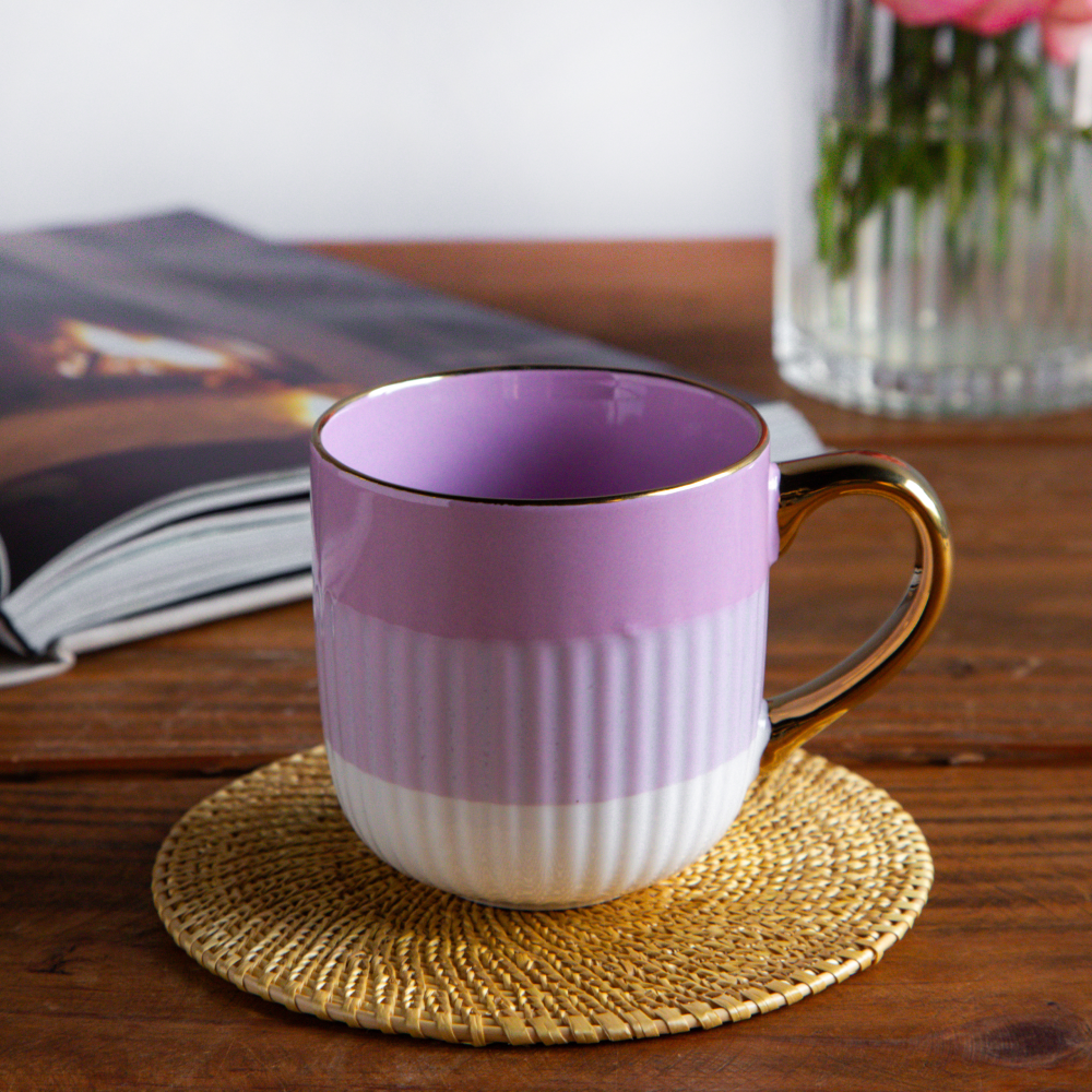 Bring calm elegance to your tea and coffee moments with the Radiance Coffee Mug – Lilac Mist. Designed in a soothing lavender and white dual-tone ribbed body, each mug is finished with a glossy glaze, golden rim, and handle for a refined luxurious look. With a 300 ml capacity, this set of two is perfect for everyday indulgence or for elevating your table setting during special occasions. Elegant, durable, and stylish, these mugs also make a thoughtful gift for weddings, housewarmings, or festive celebrations.
