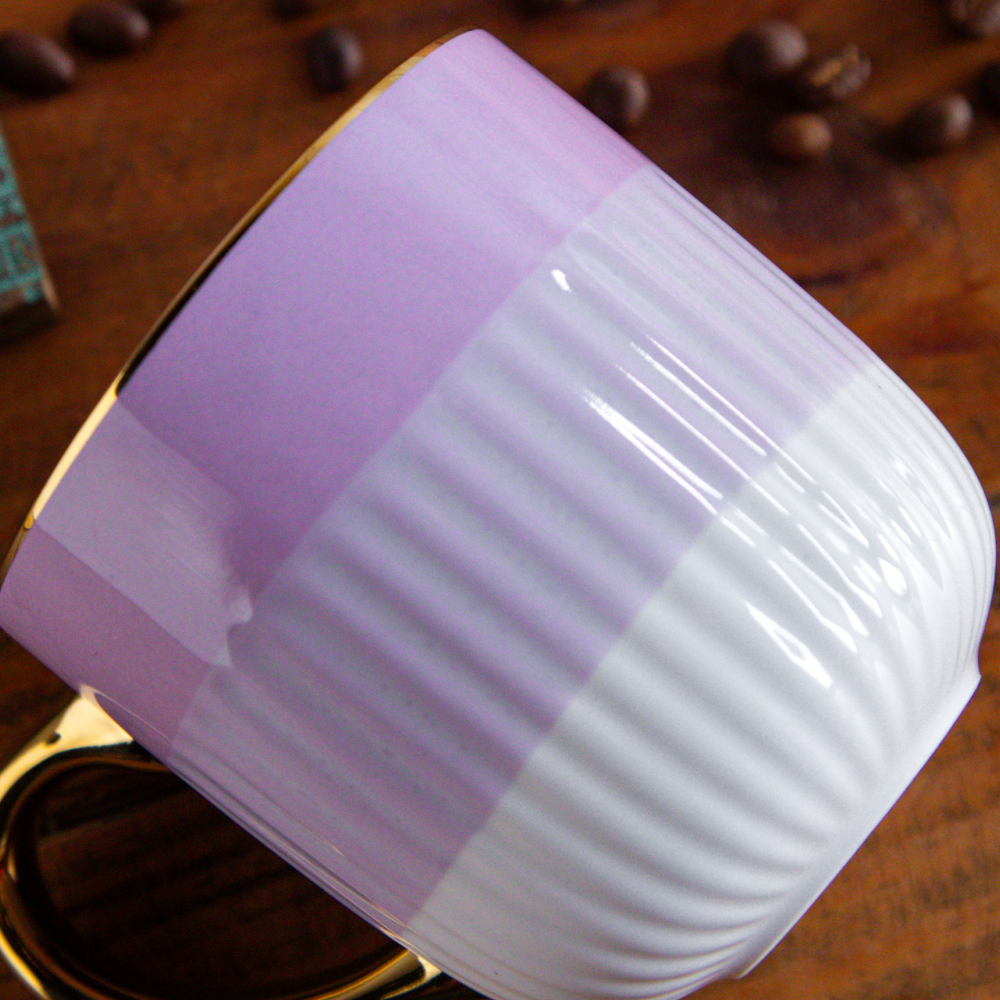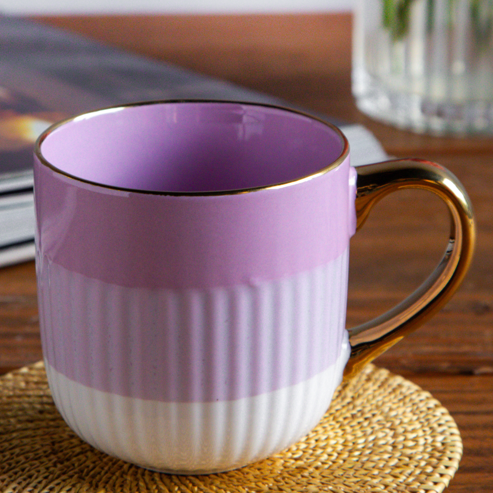 Set of 2 ribbed ceramic mugs with calming lavender tones and golden detailing.