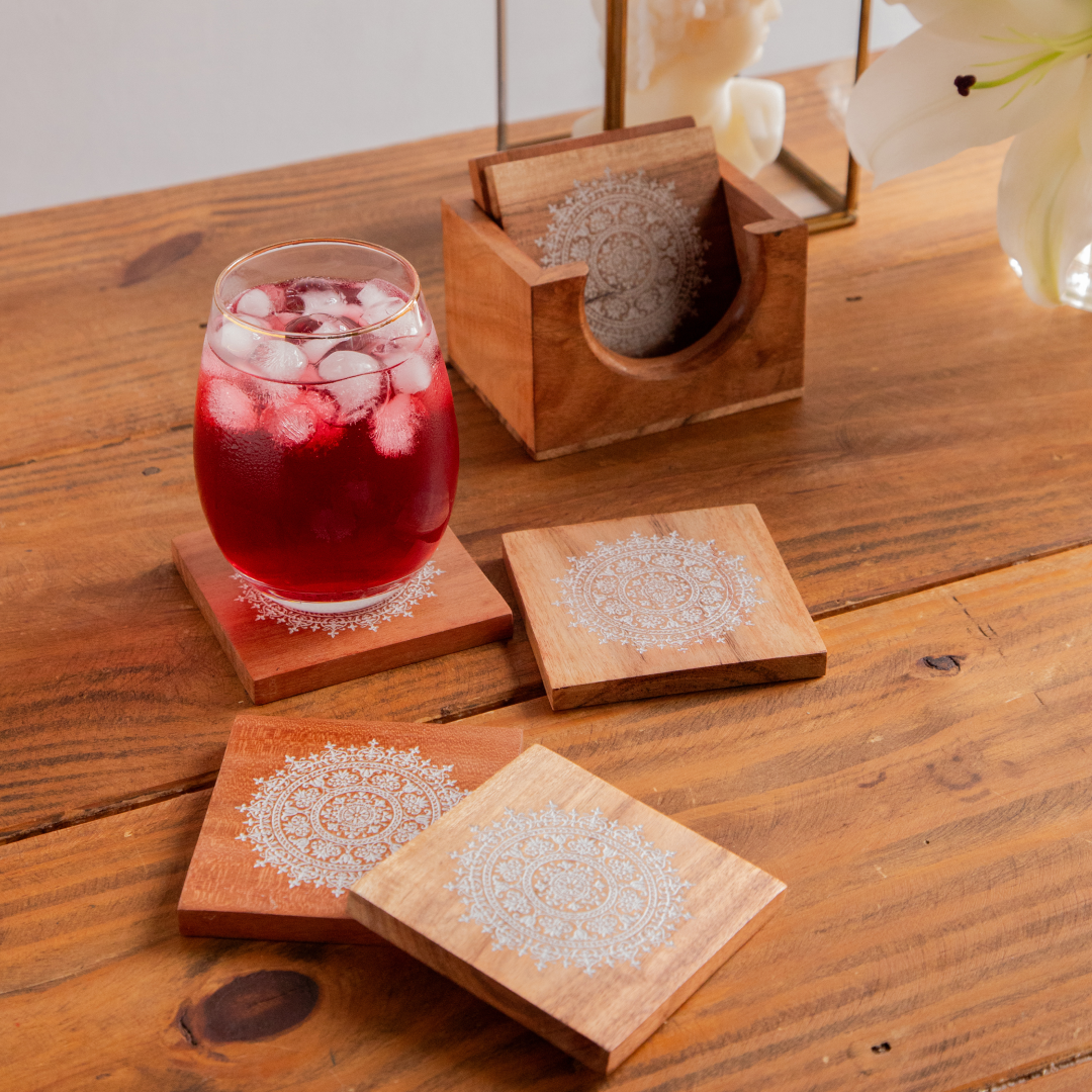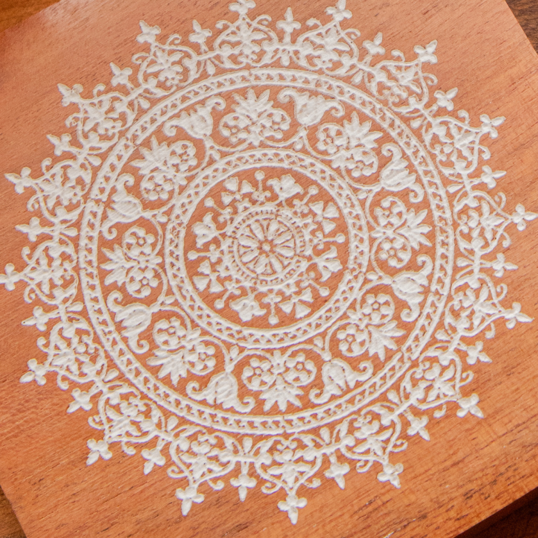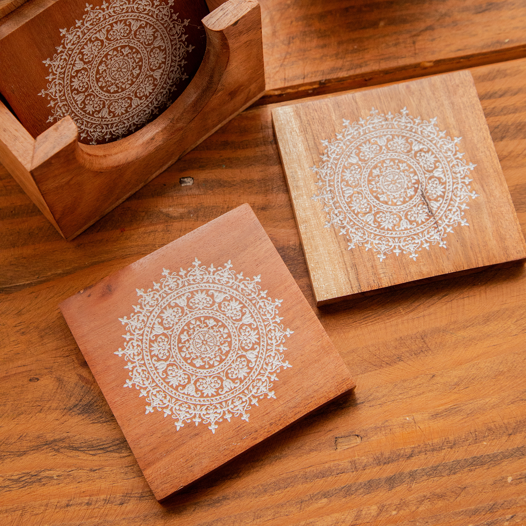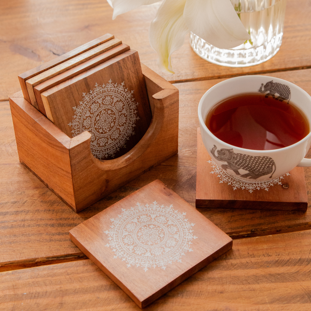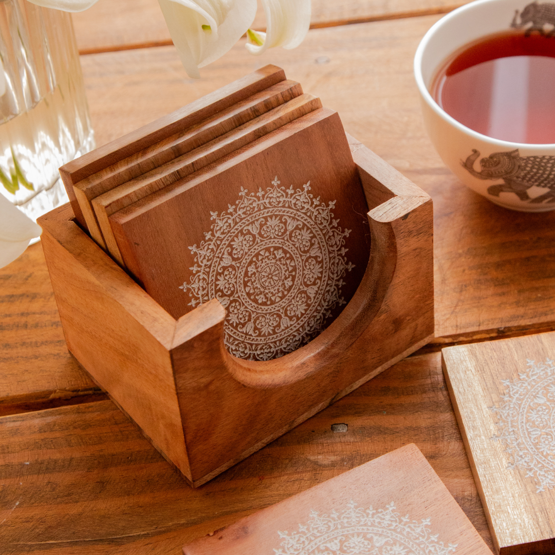 Add a peaceful, mindful touch to your tea time with these mandala-engraved Sesham wood coasters
