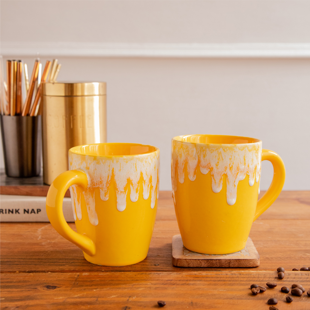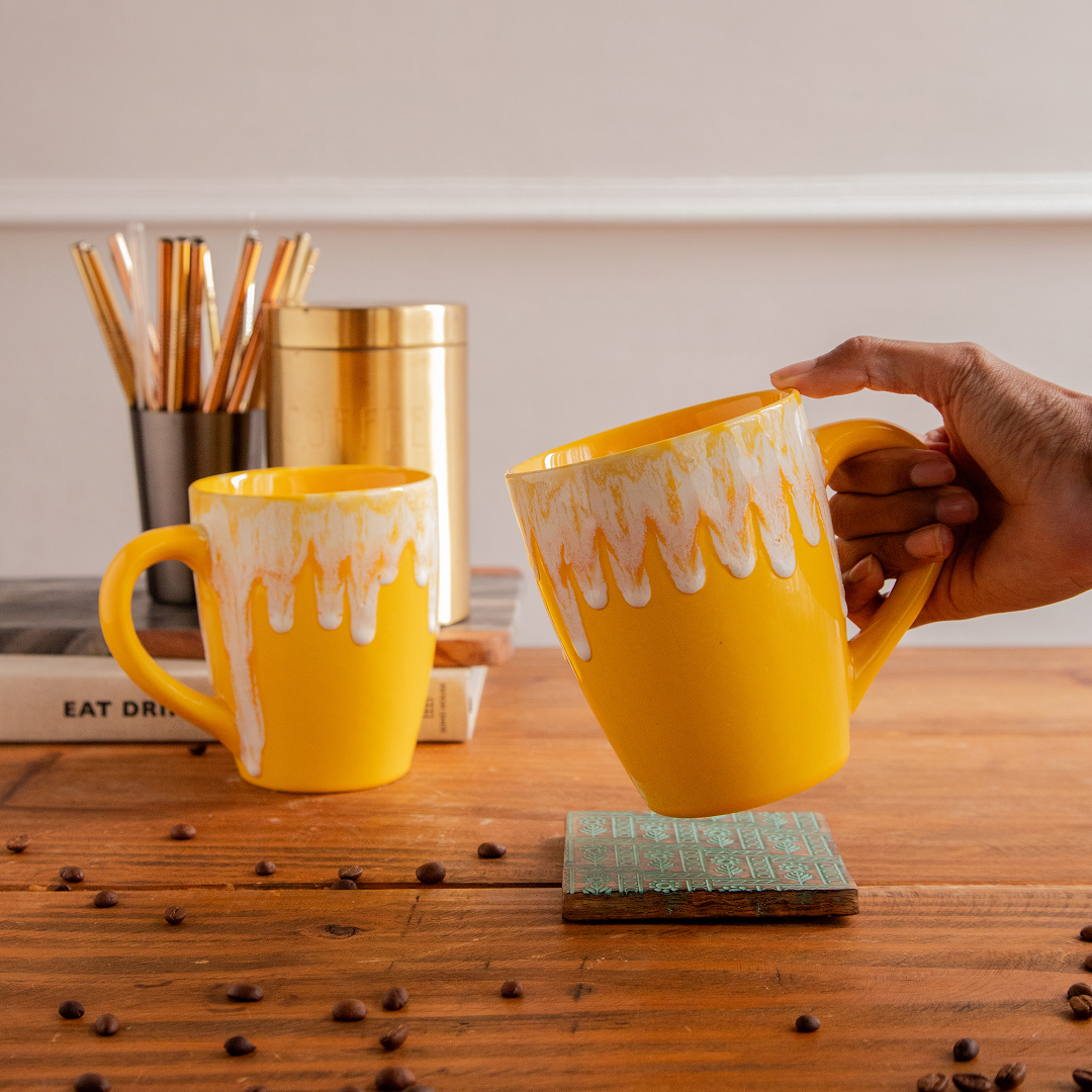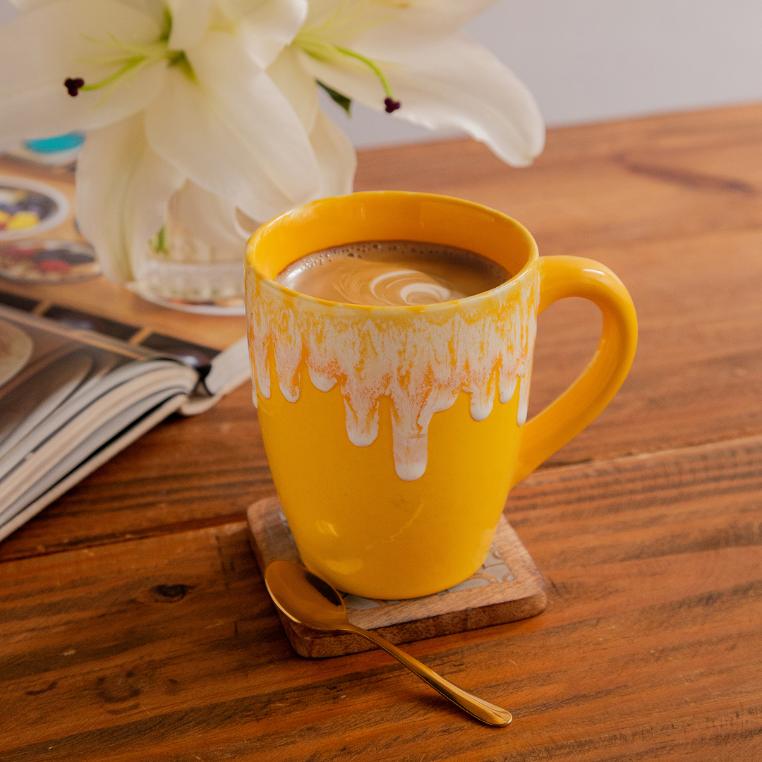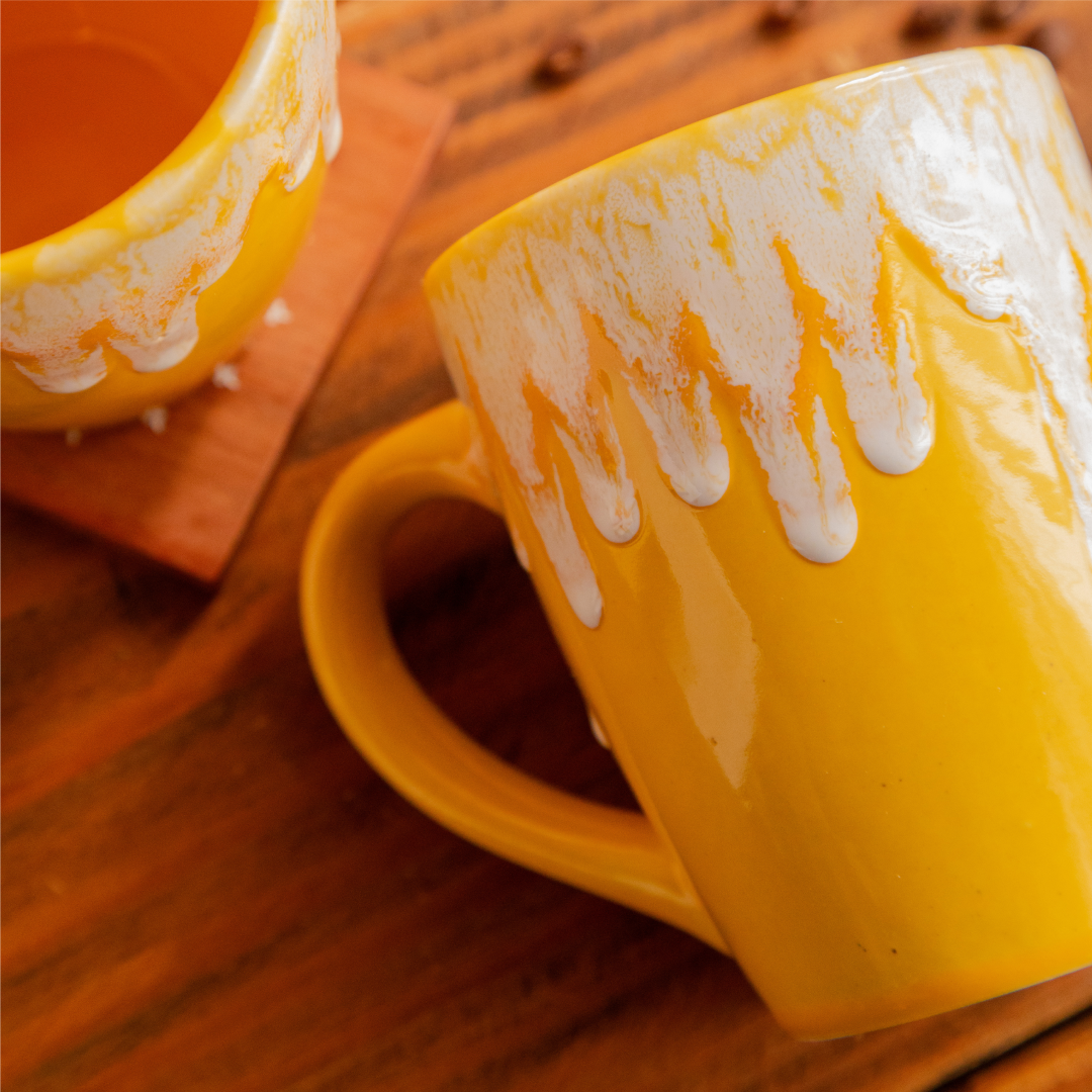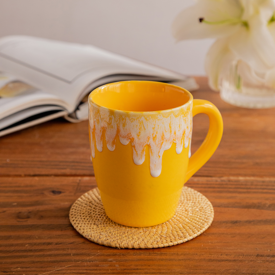 The Sunburst Drizzle Hand-Painted Ceramic Mug is your daily dose of sunshine. Featuring a vibrant yellow base with a unique white drizzle design, each mug is hand-painted to capture a playful, fresh aesthetic that brightens your coffee, tea, or latte moments.