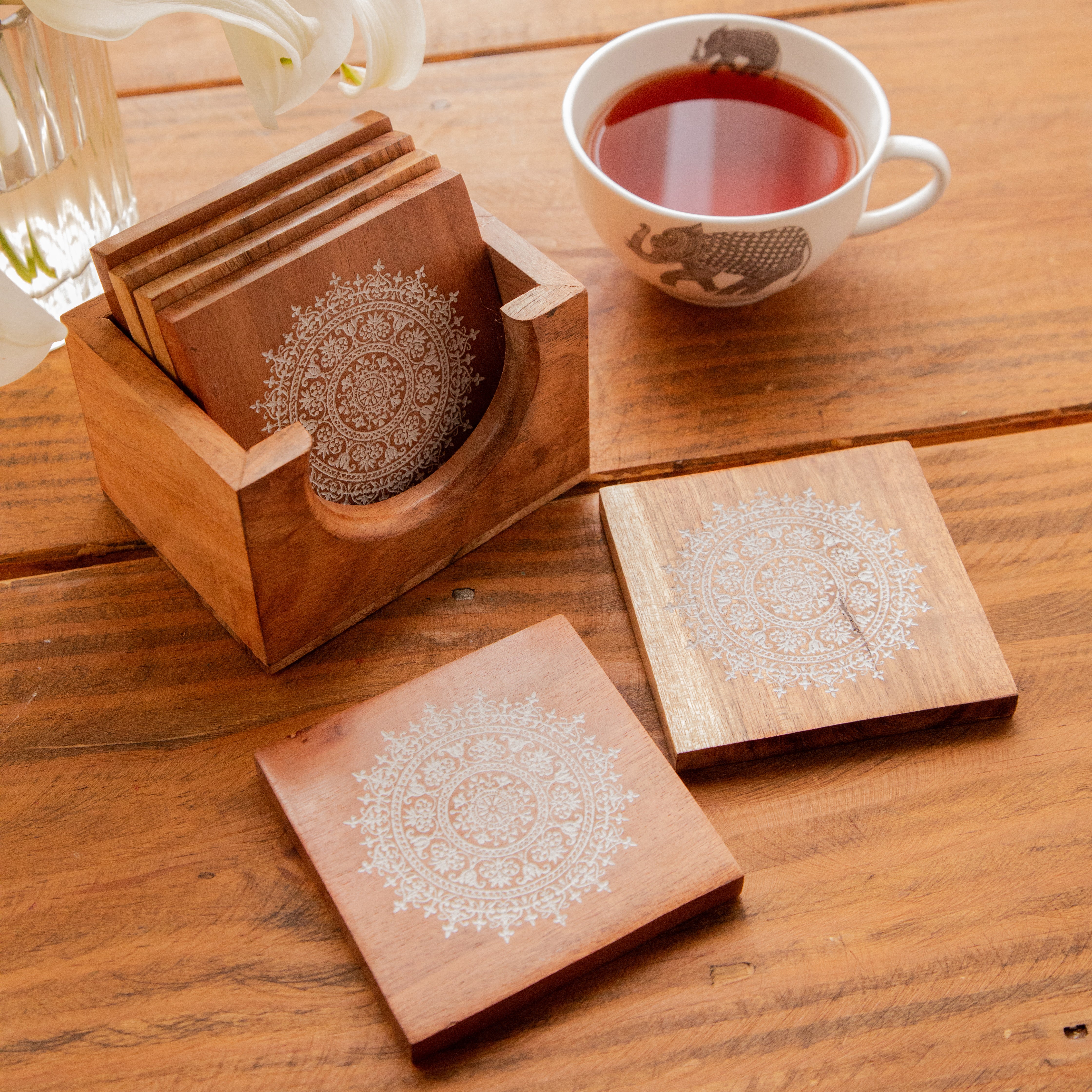Add a peaceful, mindful touch to your tea time with these mandala-engraved Sesham wood coasters