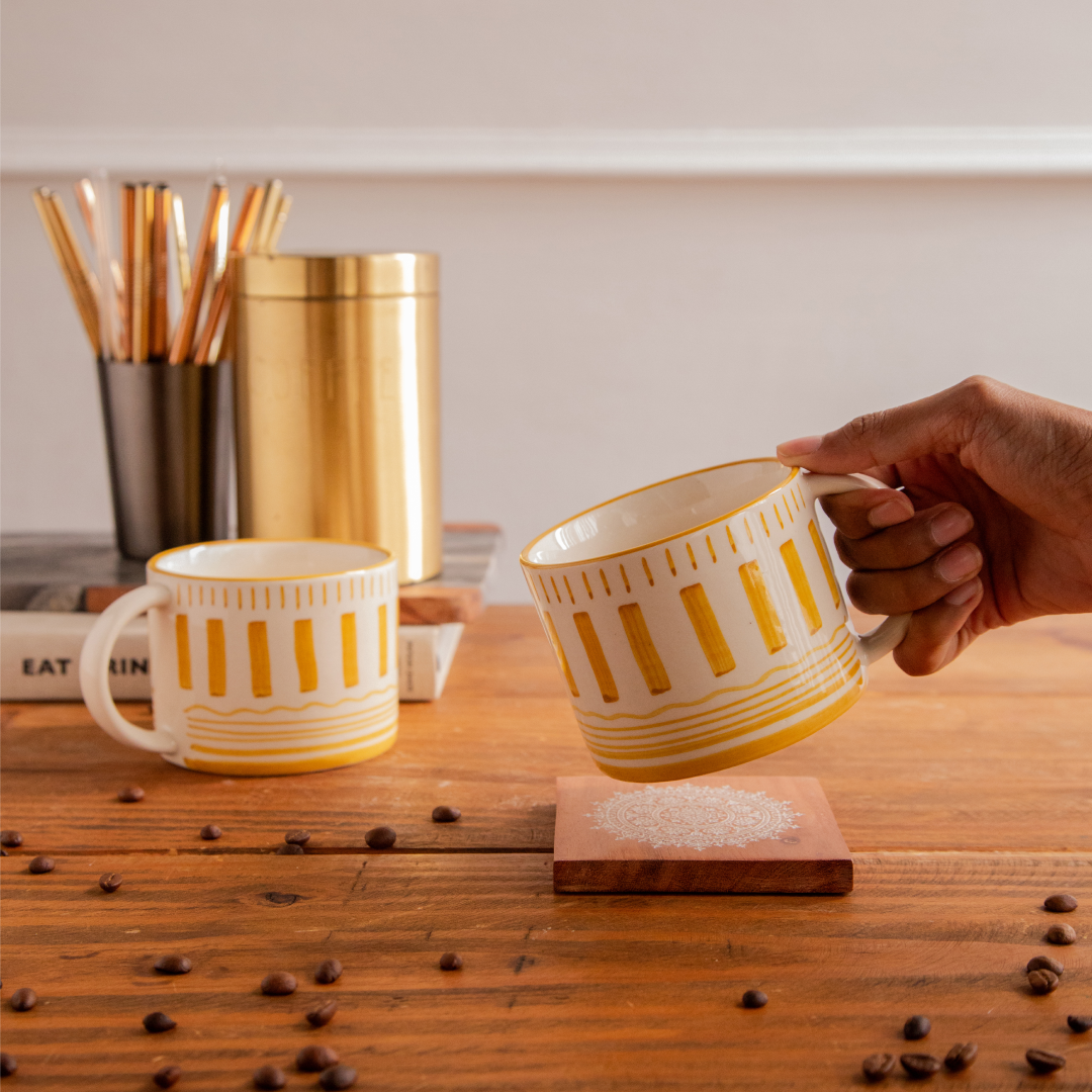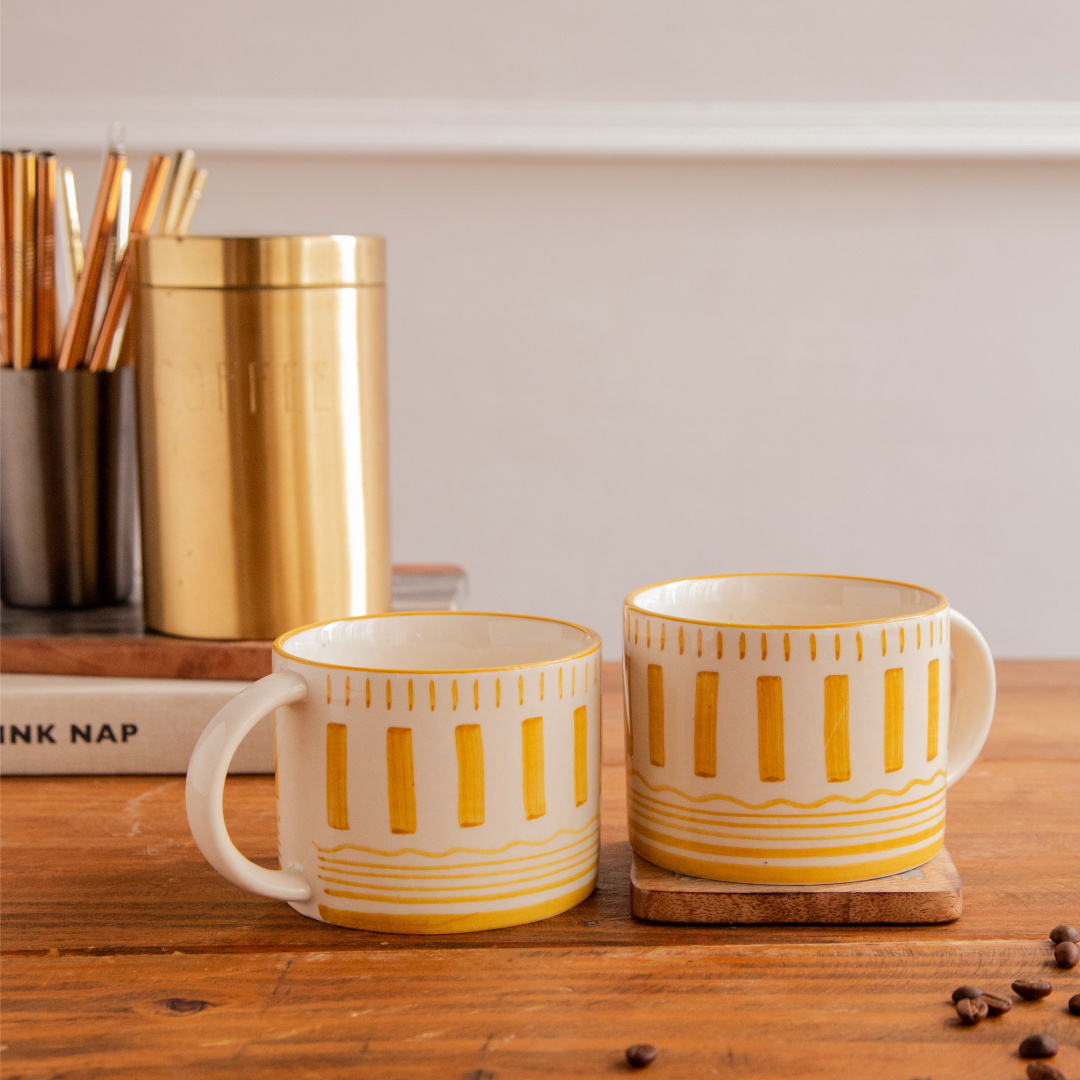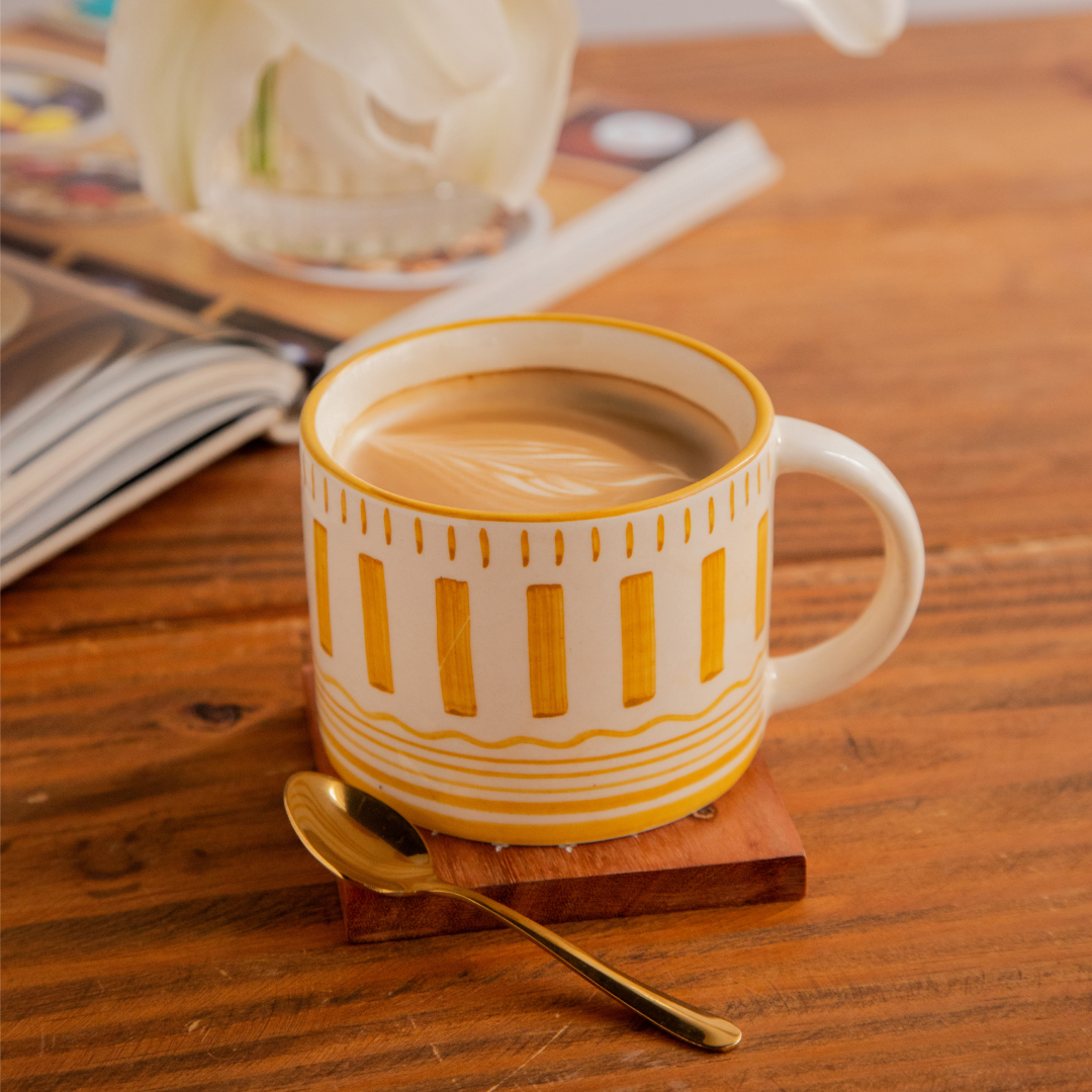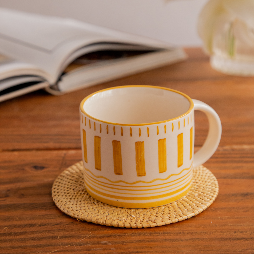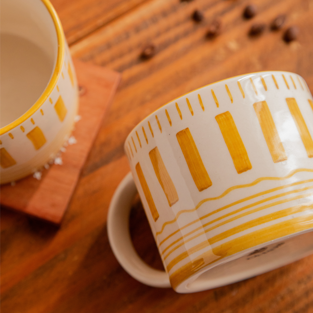 Bring home a warm touch of artisan charm with the Golden Dune Hand-Painted Ceramic Mug. Inspired by the gentle curves of sunlit desert dunes, this mug features bold golden stripes and delicate line details on a smooth ivory base — each stroke hand-painted by skilled artisans.