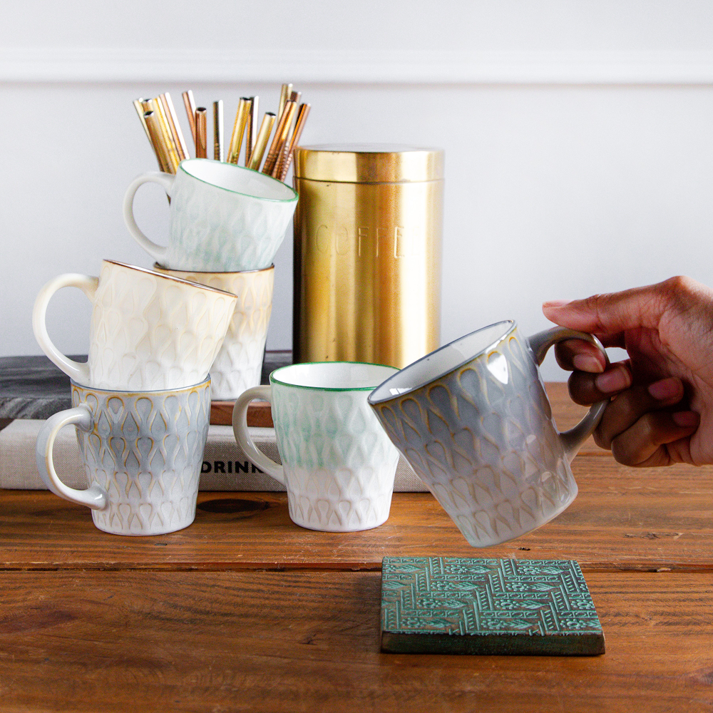Set of 6 teacups with soft gradient glaze, rim accents, and embossed leaf-inspired texture.