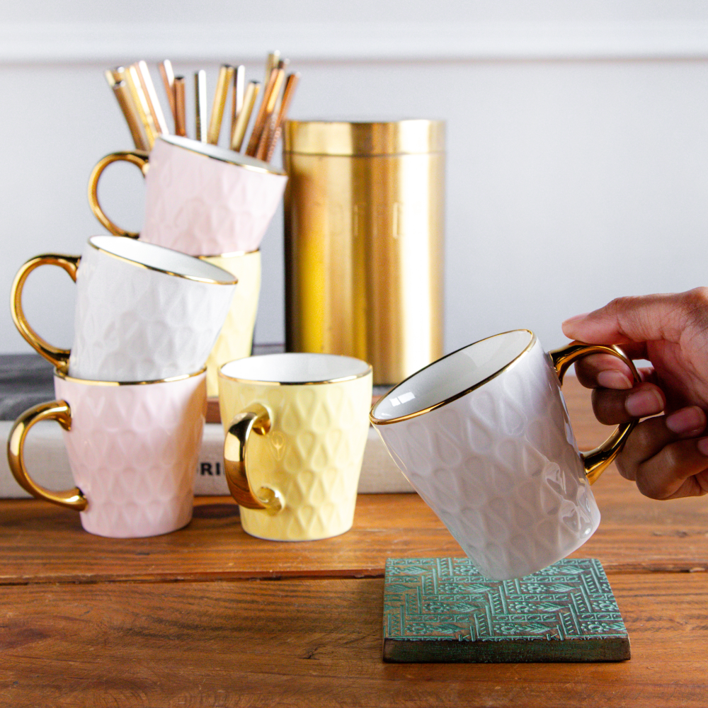 Discover elegance in simplicity with the Golden Eterna Leaf Teacups. This premium set of 6 teacups features a delicate embossed leaf design, beautifully finished with golden rims and handles for a touch of luxury. With a comfortable 200 ml capacity, these cups are perfect for tea, coffee, or herbal infusions. The set includes 3 sophisticated pastel shades — 2 pink, 2 yellow, and 2 white — making it versatile, stylish, and ideal for both everyday use and festive gatherings. Crafted from premium porcelain, these teacups combine durability with timeless charm, making them an elegant choice for personal use or gifting.
