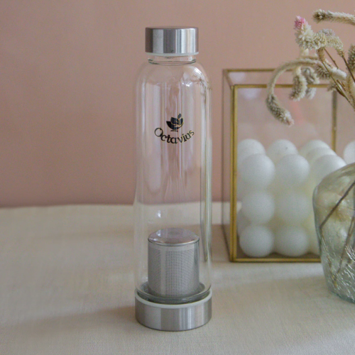 Sleek ultra clear glass bottle perfect for convenient on-the-go hydration. This bottle has two openings as it has a steel infuser at the bottom. The infuser can be used to infuse water with your favorite fruit, herb, etc Also perfect as a reusable bottle for safely & compactly storing liquids, both cold & hot. Unlike a plastic bottle that leeches chemicals, this food-safe high quality, thick, clear glass bottle does not change the taste of liquids. The infuser can be left in place for less bitter teas or removed to prevent oversteeping. Discover our sleek and ultra-clear glass bottle, an essential piece of teaware for on-the-go hydration. Featuring a steel infuser at the bottom, it allows for fruit and herb infusion, making it perfect for enjoying flavored water anytime, anywhere. Crafted from high-quality, food-safe borosilicate glass, this reusable bottle maintains the taste integrity of your beverages without any chemical leaching. Whether you prefer cold or warm drinks, this versatile bottle is designed to keep liquids safely stored. The infuser can be left in its place for less bitter teas or removed to prevent over-steeping, ensuring a perfectly brewed beverage every time.